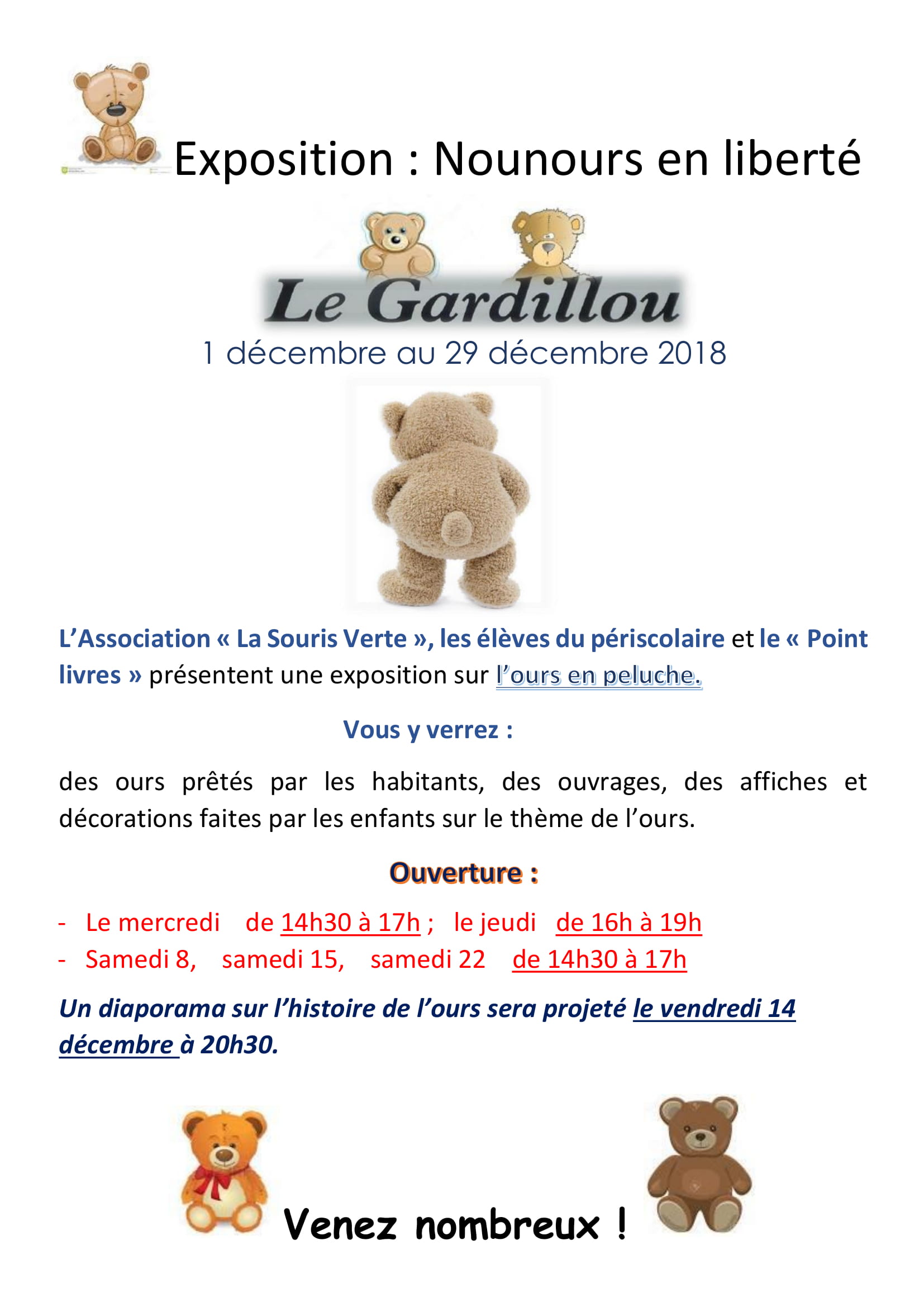 La Souris Verte et le Point livres ont investi les locaux de l’association et du bar des gardillous pour présenter a la population l’histoire de l’ours concoctée par Martine et illustrée largement par les nounours prêtes pour l’occasion. Les enfants ont également participé notamment au décor qui trône dans la cheminée du bar. Nous saluons cette initiative collective qui a permis aux visiteurs de revivre des moments heureux de leur enfance.